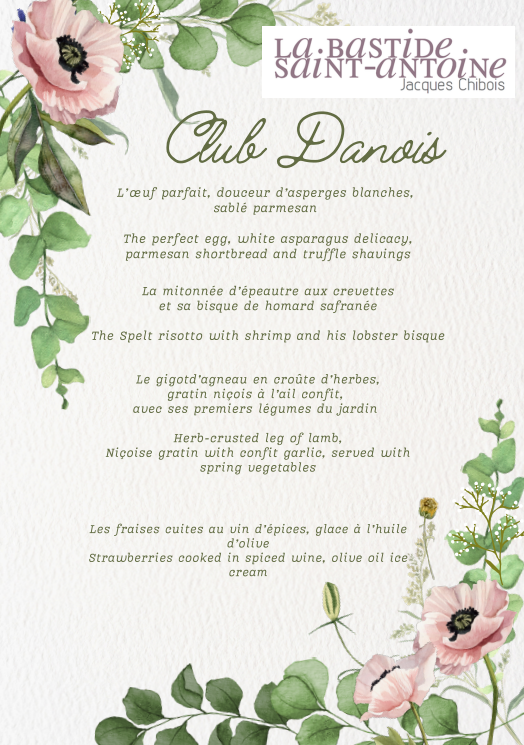 La Bastide-Saint-Antoine – en anerkendt restaurant og medlem af Les Grandes Tables du Monde – inviterer Club Danois’s medlemmer på en dejlig gastronomisk rejse, hvor smagsoplevelser, aromaer og farver konkurrerer i dristighed og subtilitet.