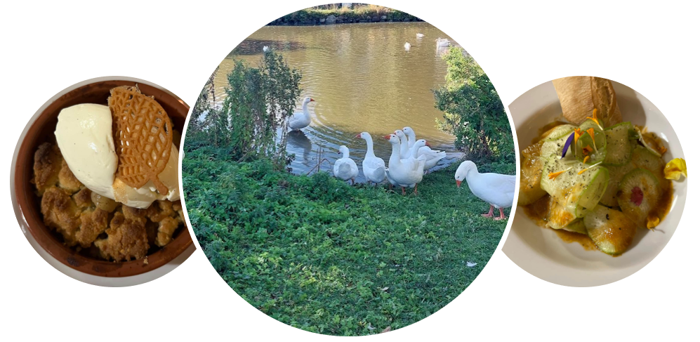 Helstegte ænder serveret med rødkål, brune og hvide kartofler, halve æbler med gelé samt brun sauce
